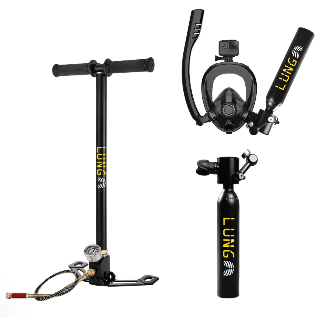 Atornilla el mini-tanque de aire a la máscara hasta que quede ajustado, asegurándote de que el manómetro esté colocado correctamente.